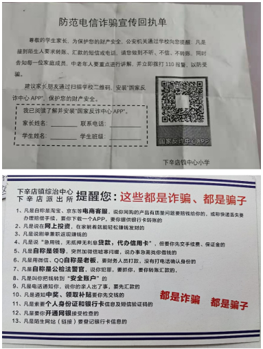 为进一步扼制此类现象发生,12月23日,下辛店镇综治办、派出所联合中小学校,对老师开展培训,再由老师在课堂上开展防电诈宣讲。希望用以点带面、小手牵大手的方式,让学生们将课堂学到的防电诈小知识讲给家长听,让学生家长们都安装“国家反诈APP”,共同筑起防电诈安全长城,让电信诈骗无处可骗,能更好地守护好人民群众的财产安全。(通讯员江来、冷思源、邓鹏)