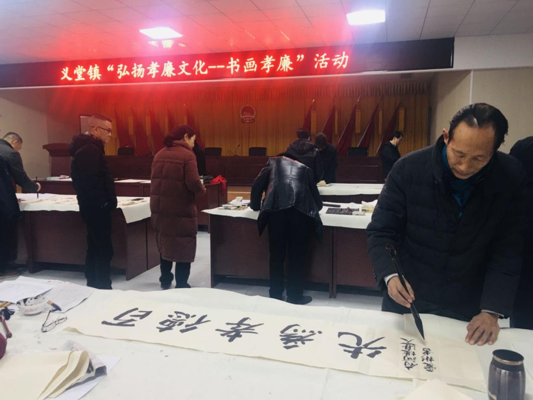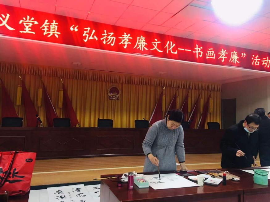 为大力弘扬孝廉文化,进一步提升机关清廉文化,12月24日,义堂镇举办“弘扬孝廉文化——书画孝廉”创作活动。原政协副主席吴道本,县文联主席张赤平,县书法家协会主席鞠爱斌等出席了活动。活动中,大家参观了红光村孝廉基地、金龙古寺,然后在镇会议室集中进行书画创作。作品内容主要结合市县党代会精神和孝廉文化,将社会主义核心价值观、党风廉政建设、乡风文明建设等通过警示佳句和水墨作品一一展示出来。