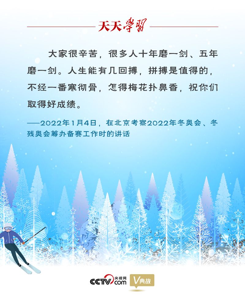 2022年1月4日下午,习近平总书记来到北京二七厂冰雪项目训练基地,走进六自由度训练馆、综合风洞馆、速滑馆、体能中心医疗站、专项体能训练馆等,察看冰雪运动科学训练、运动员康复治疗、体能训练等情况,并用“不经一番寒彻骨,怎得梅花扑鼻香”勉励备战冬奥的运动员们。