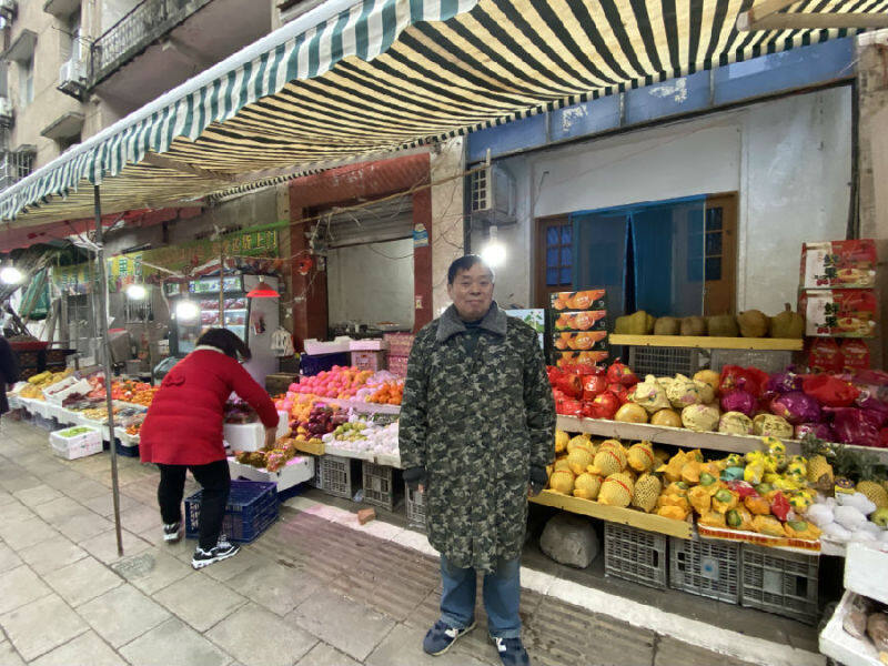 水果湖街水果商铺老板李家宽(右)接受记者采访(余惠玲 摄)