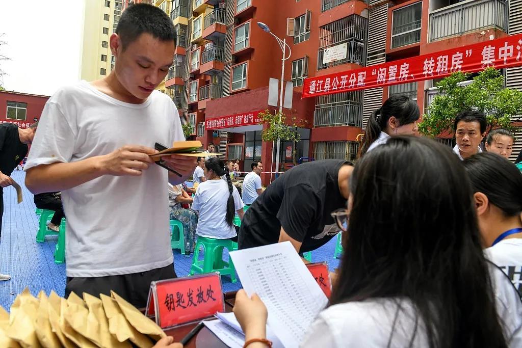 △2021年6月,四川省巴中市通江县公租房民生家园,工作人员为居民发放钥匙。