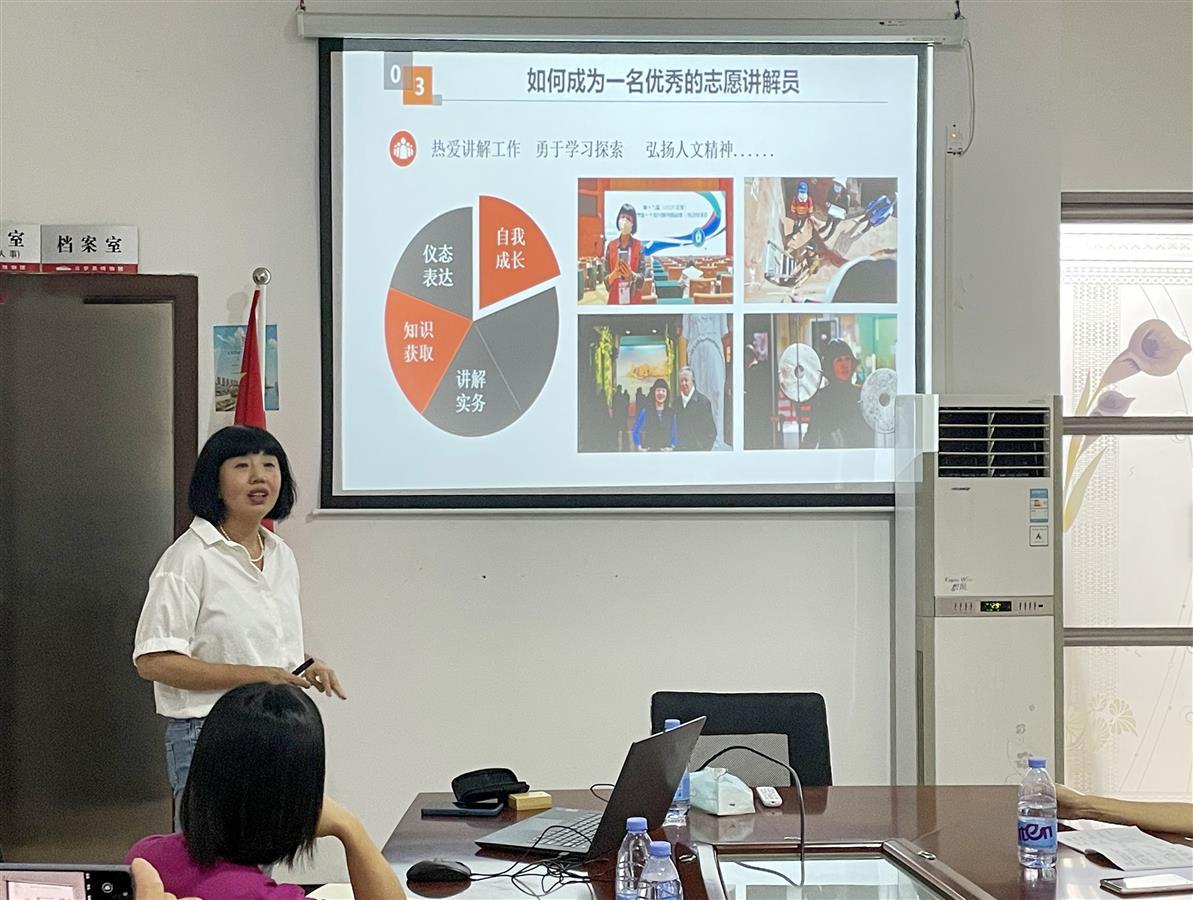 培训现场,国家一级博物馆志愿讲解员、湖北省博物馆志愿者之星,湖北省岗位学雷锋标兵,中央文明办、国家文物局志愿服务典型案例入选者马靖宇老师为大家详细讲解《如何成为一名优秀的志愿讲解员》。围绕博物馆讲解员的意义与时代精神、博物馆讲解的职责与评量要点、展厅接待、讲解礼仪等培训内容,通过交流互动的方式开展培训。