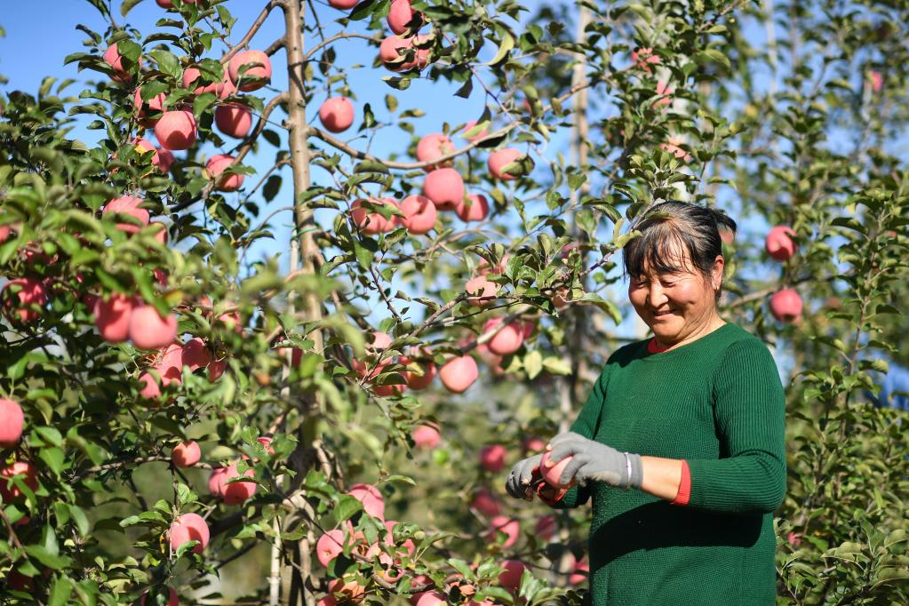 2022年10月10日,果农在延安市洛川县阿寺村一处果园采摘苹果。新华社记者 张博文 摄