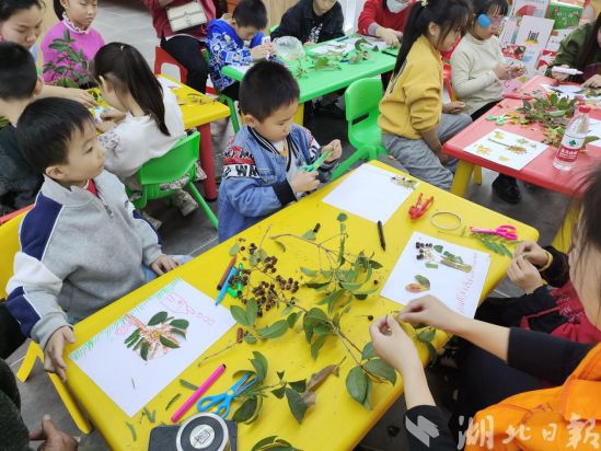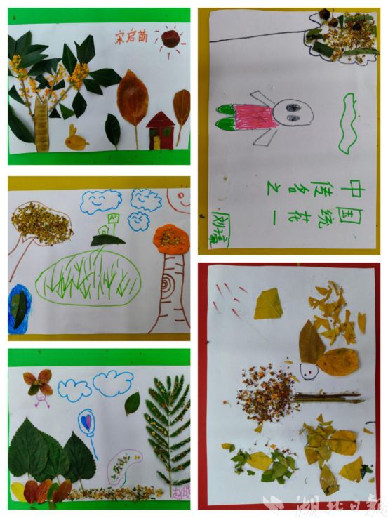最后是小朋友最喜爱的手工环节——制作桂花图画,大家在社工、志愿者和家长的帮助下用桂花叶子、花朵与果实制作出一幅幅彰显童真、生命力与创意的作品,表达对家乡的热爱。