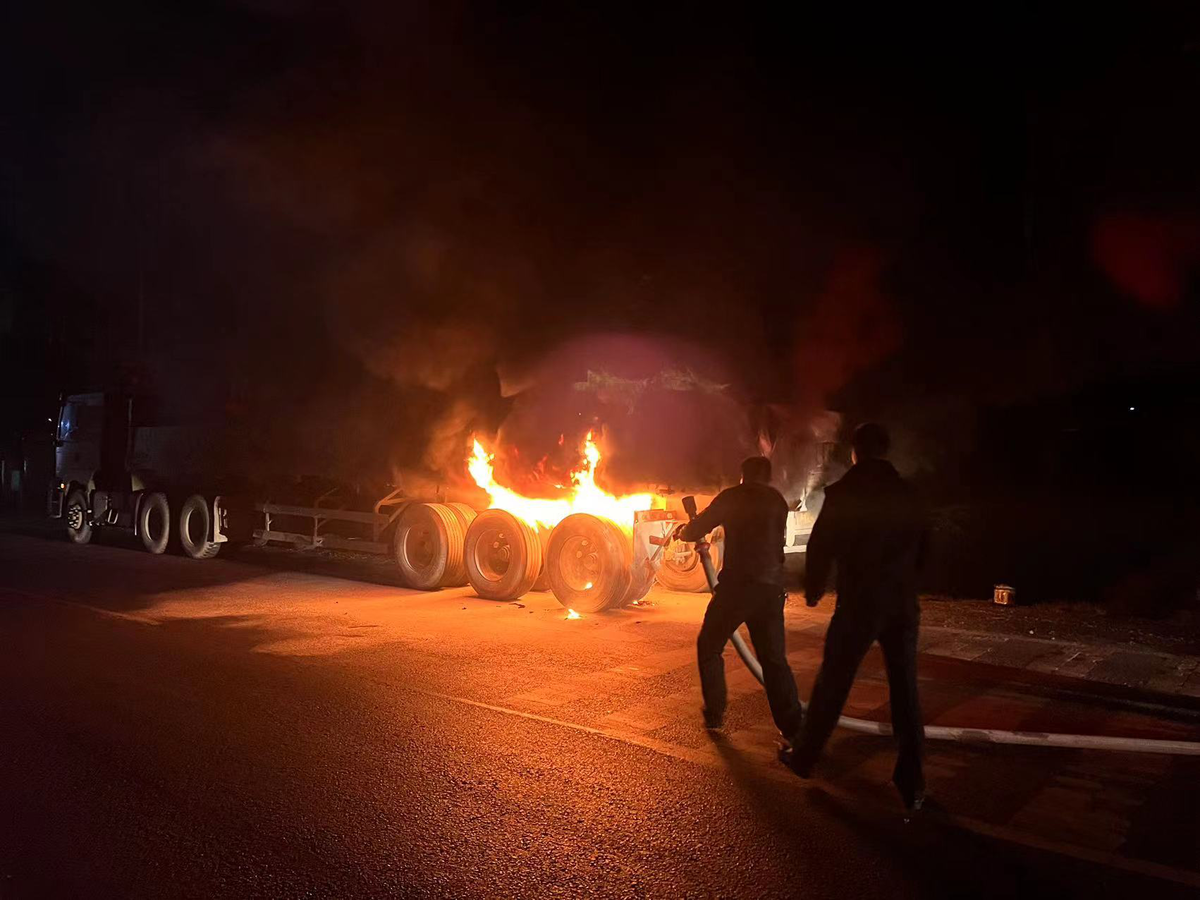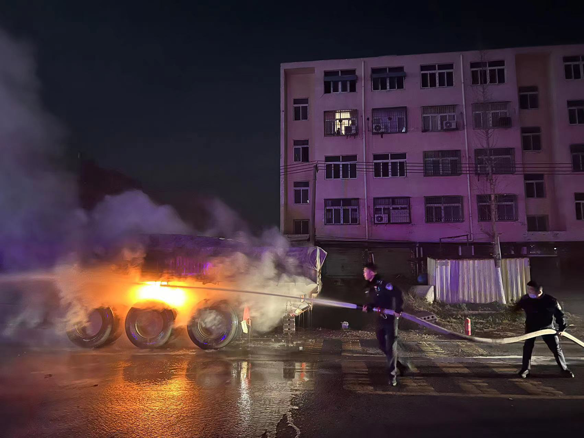 12月9日,在云梦县下辛店派出所外突然传来“砰”的一声巨响,在G347国道旁边有一辆重型半挂牵引车车厢后部着火,周边居民纷纷出来查看情况,下辛店派出所民警第一时间赶到现场,发现一辆重型半挂牵引车车厢后部着火,火苗正从车底向上蔓延,情况十分危急。