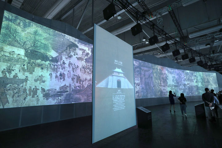参观者在香港亚洲国际博览馆内观看《清明上河图3.0》数码艺术香港展(2019年7月26日摄)。新华社记者 吴晓初 摄