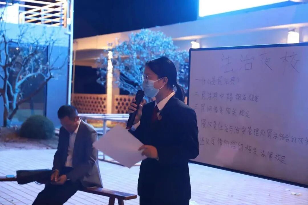 红旗下、晚风里,红白相间的村委会广场,留守在村里的老人孩子早早拿着他们的小板凳围成一个圈静静坐着、等待着活动开始,一场别开生面的“乡土法治夜校”随着人员的到齐拉开了序幕。