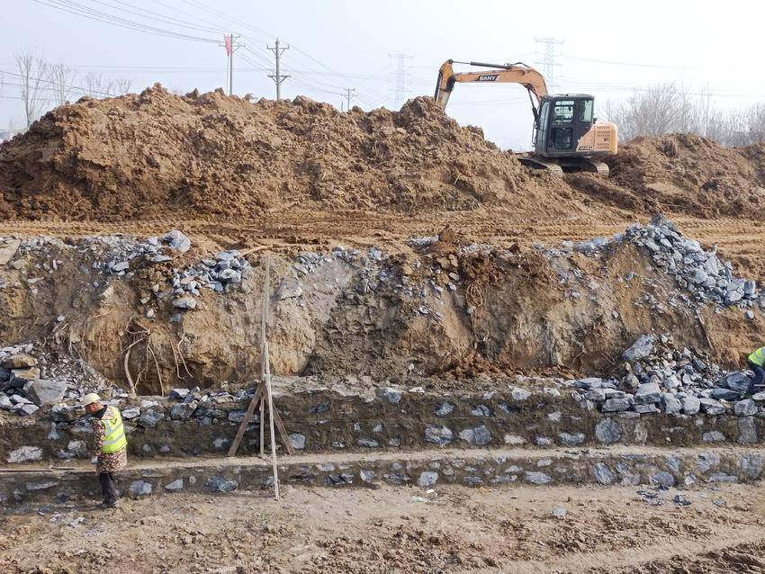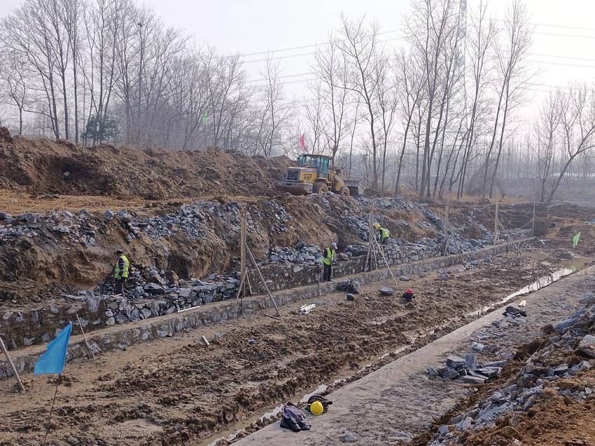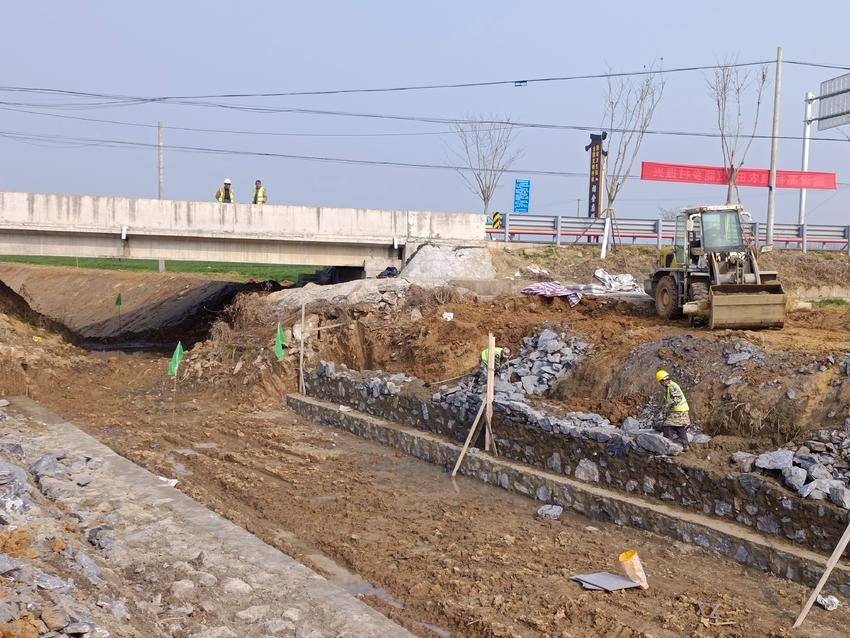 1月8日,云梦县胡金店镇涢水西支片区(联合桥)高标准农田建设现场,工人们忙着清挖沟渠,浆砌护坡。