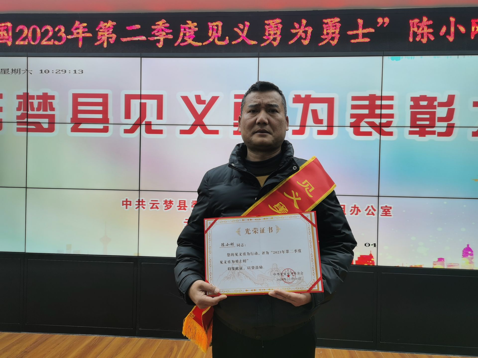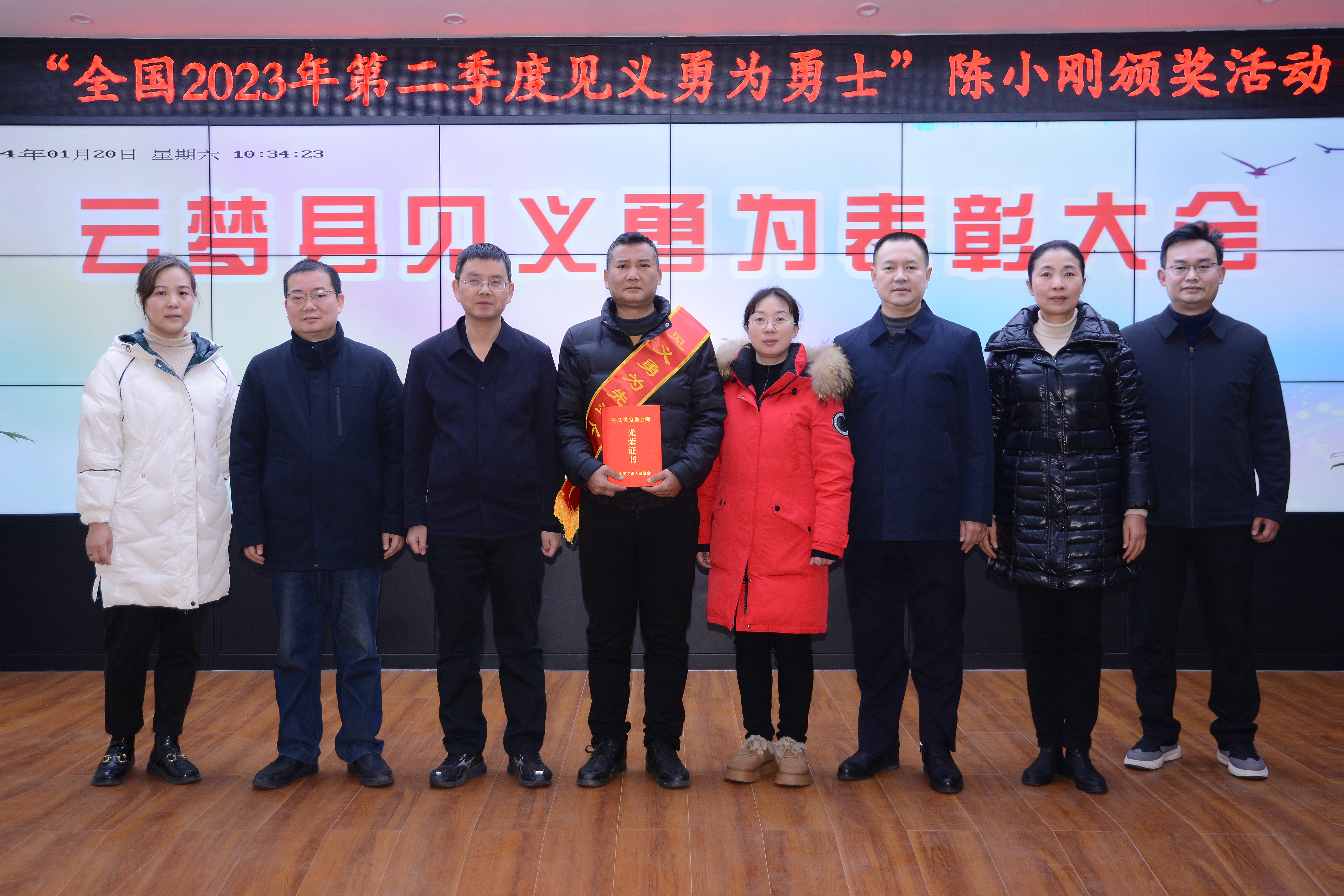 与会领导为获得“全国2023年第二季度见义勇为勇士”陈小刚进行颁奖。