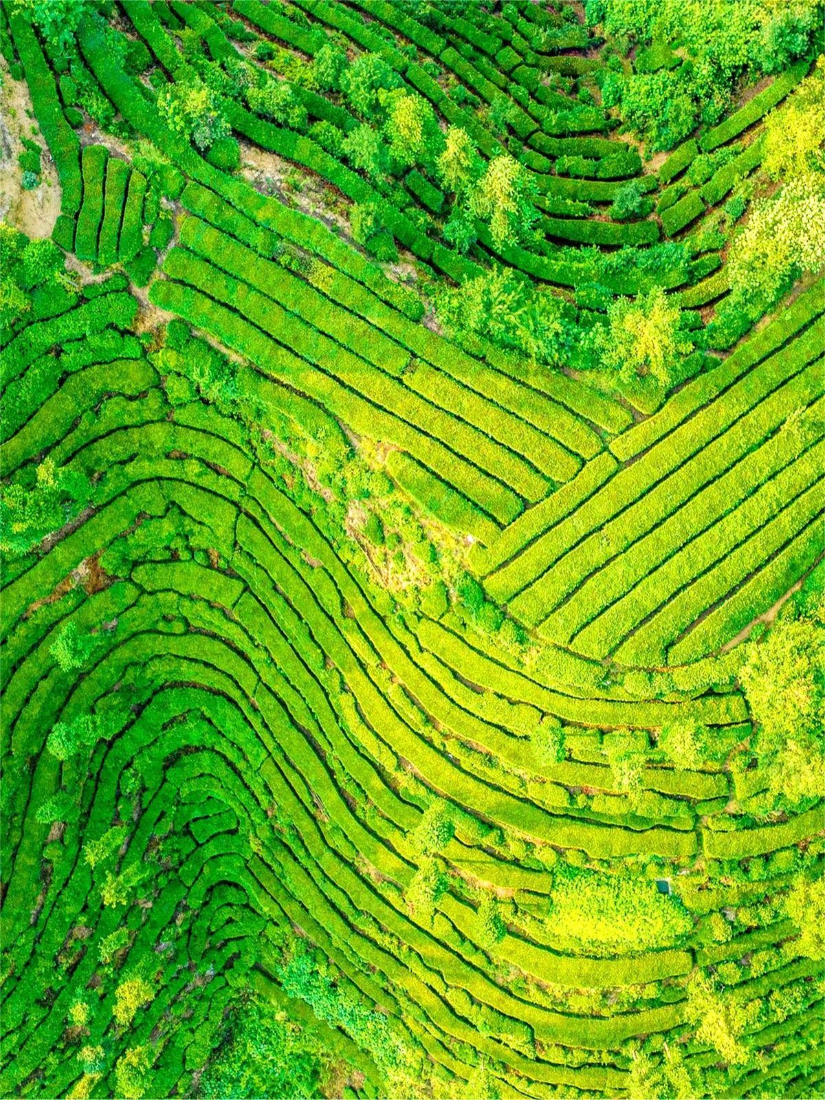 宜昌市夷陵区邓村乡由坡地改造的梯田茶园呈现满园葱绿景象。(视界网 张国荣 望作信 摄)