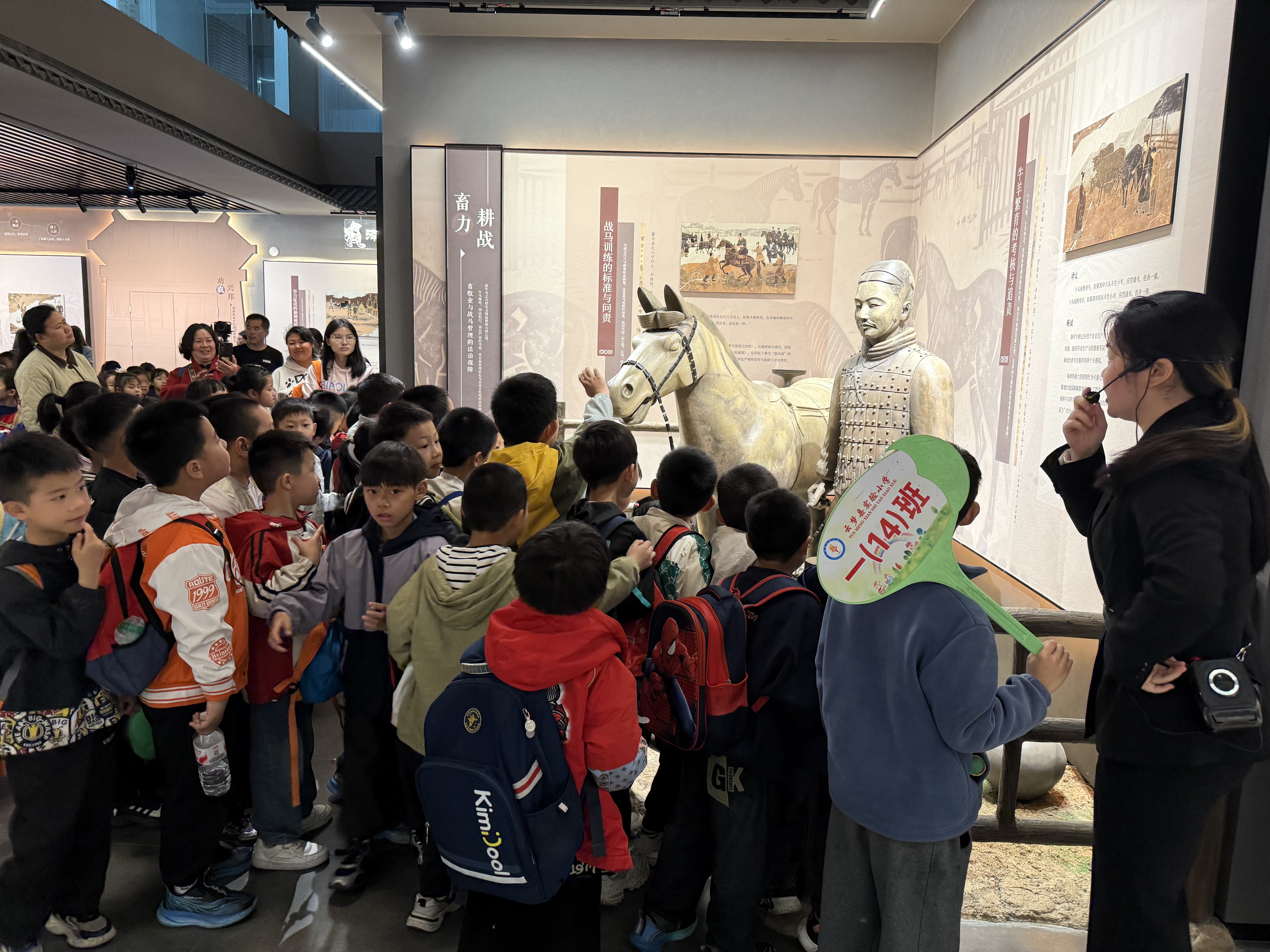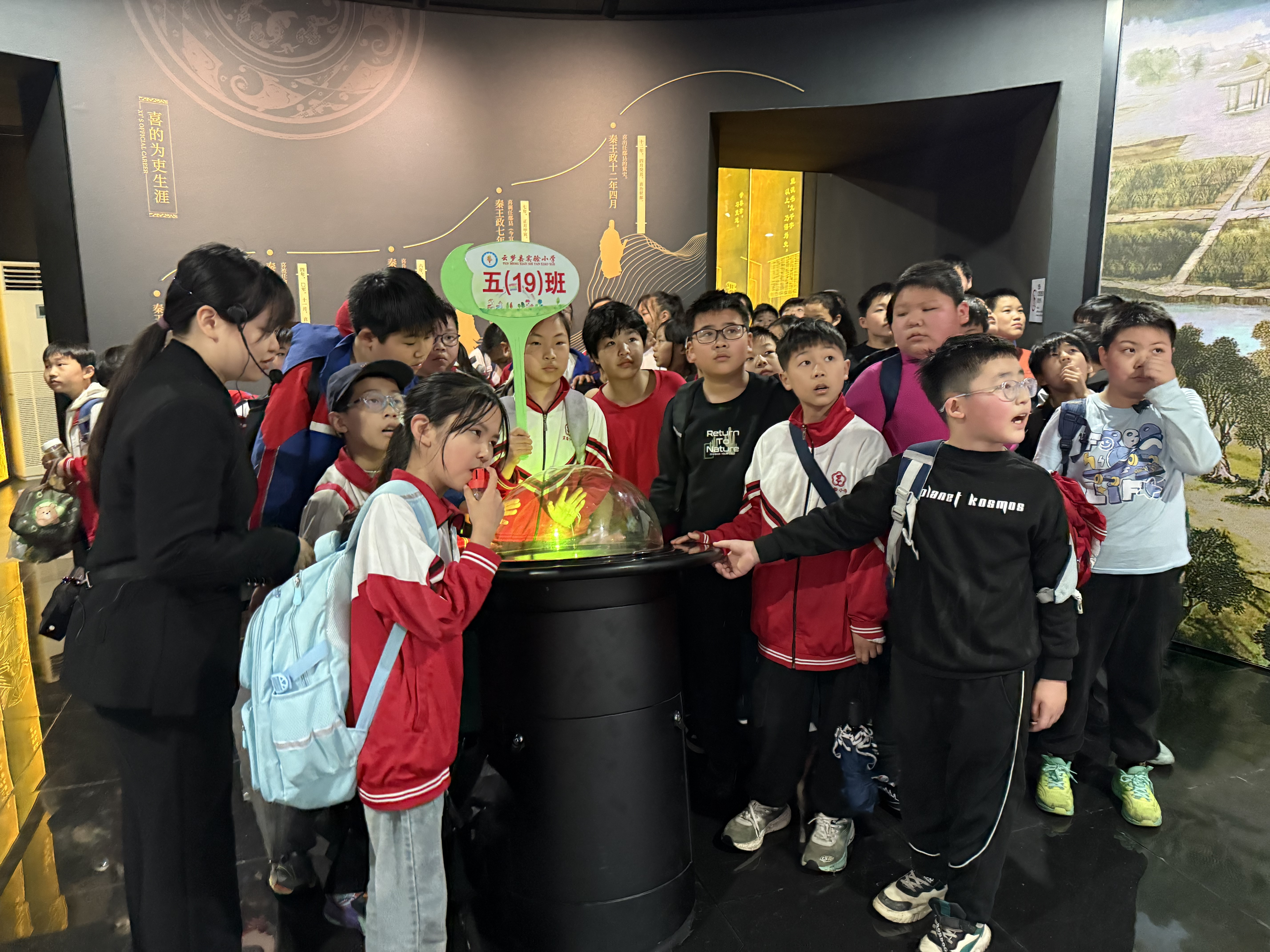 在随后的问答环节中,孩子们踊跃举手,争相回答关于秦代生活与法律的小问题,现场气氛热烈。讲解员重点介绍了睡虎地秦简中的《田律》。令人惊叹的是,秦朝法律规定春天禁止砍伐树木、捕杀鸟兽、污染水源——这堪称中国最早的“环保法”,比西方同类法律早了一千多年。讲解员还介绍了睡虎地作为秦汉墓葬群的重要地位,并特别指出M11号墓正是墓主“喜”的安息之所。1975年,该墓出土了1155枚秦简,成为新中国考古的重大发现之一。